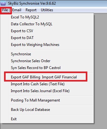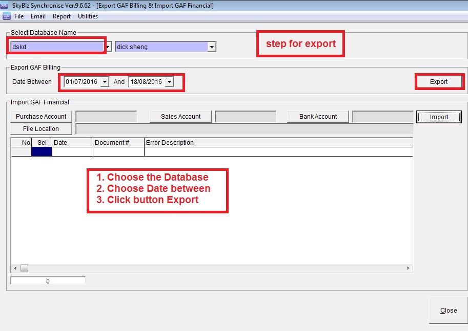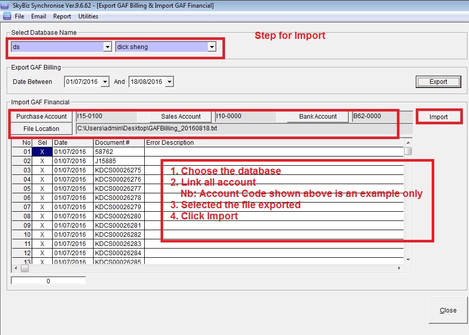 Choose the database >> link all account code >> select the exported GAF file >> click "Import"