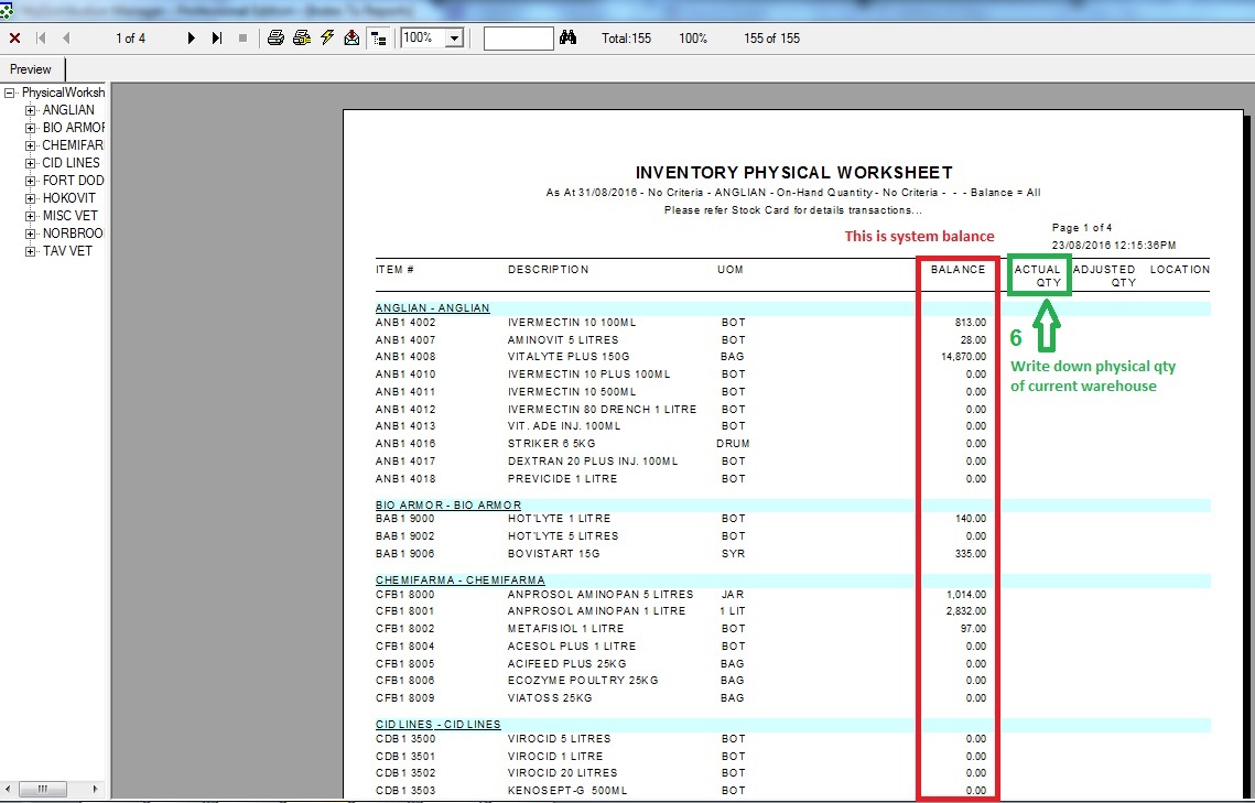 Step 2 : Print Inventory Physical Worksheet and fill up actual warehouse quantity