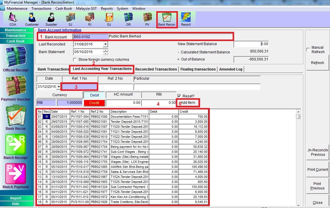 Step 1: Go to Bank Recon >> choose Bank Account >> click "Last Accounting Year Transactions" >> key in the Reference Number in "Ref. 1 No" column >> key in the un-presented cheque for last year account
