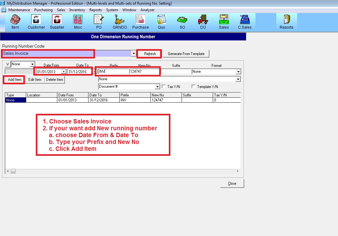 Step 2: Choose Sales Invoice >> Refresh >> Change Date From & Date To >> Type your Prefix and New No >> Click Add Item
