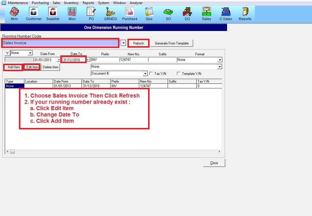 Step 2: Choose Sales Invoice >> Refresh >> Click Edit Item >> Change Date To >> Click Add Item