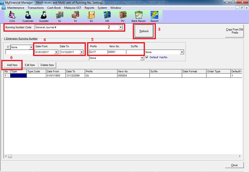 Step 2: Select "General Journal #" >> click "Refresh" >> change Date From and Date To >>key in Prefix and New Number >> click "Add Item"