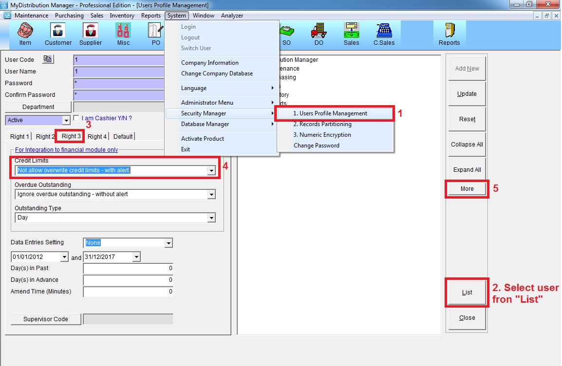 Select user ID from "List" >> go to "Right 3" >> select "Not allow overwrite credit limits - with alert" >> click "More"
