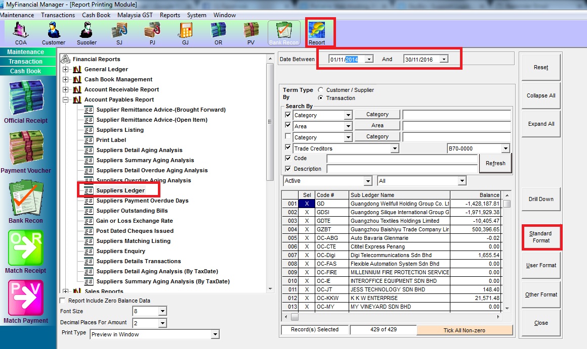 Go to Reports >> Account Payable Report >> Suppliers Ledger >> choose date between >> click "Standard Format" to view