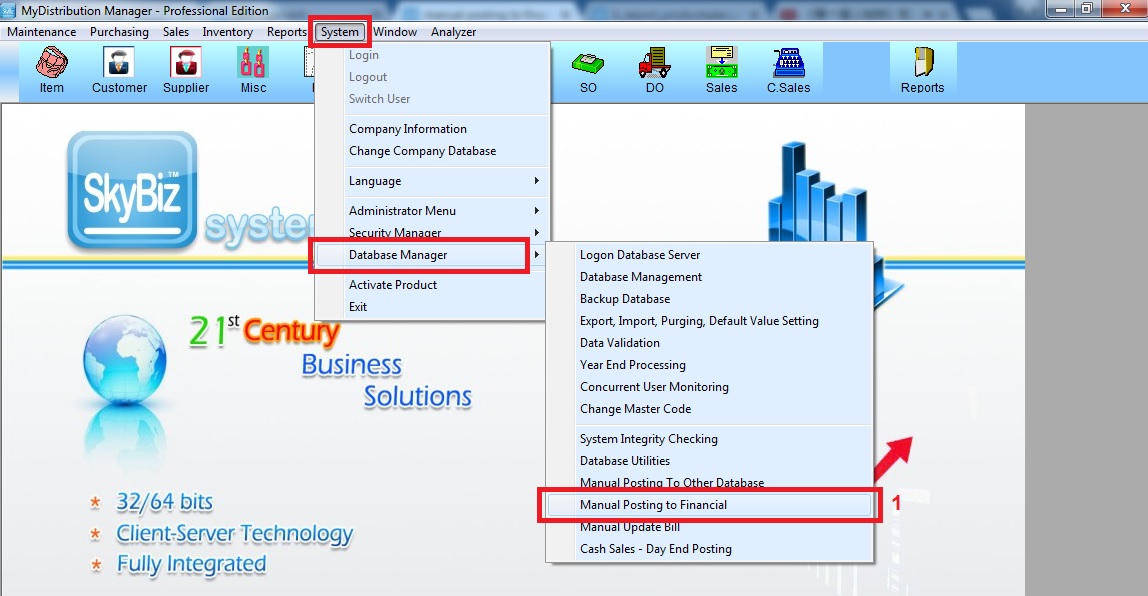 Step 1: Go to System >> Database Manager >> Manual Posting to Financial