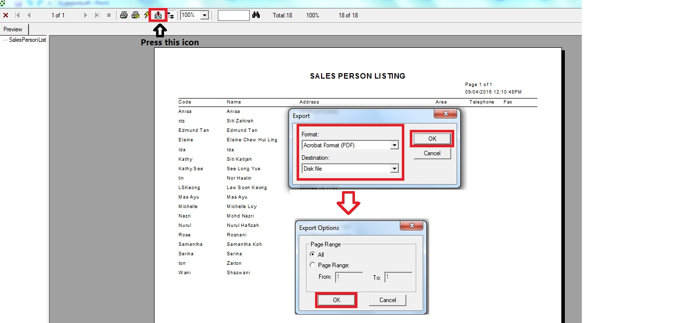 Step 1 : Click export icon and choose Format: Acrobat Format (PDF) or Excel