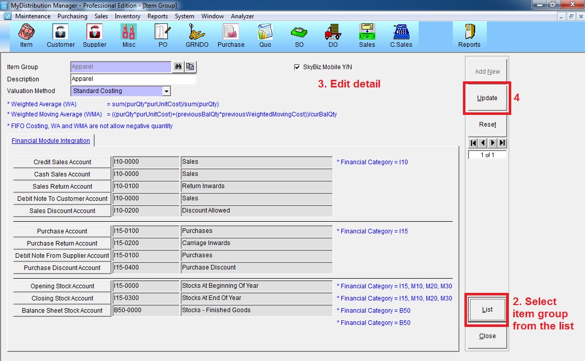 2. Click "List" >> choose item group code >> edit detail >> click "Update"