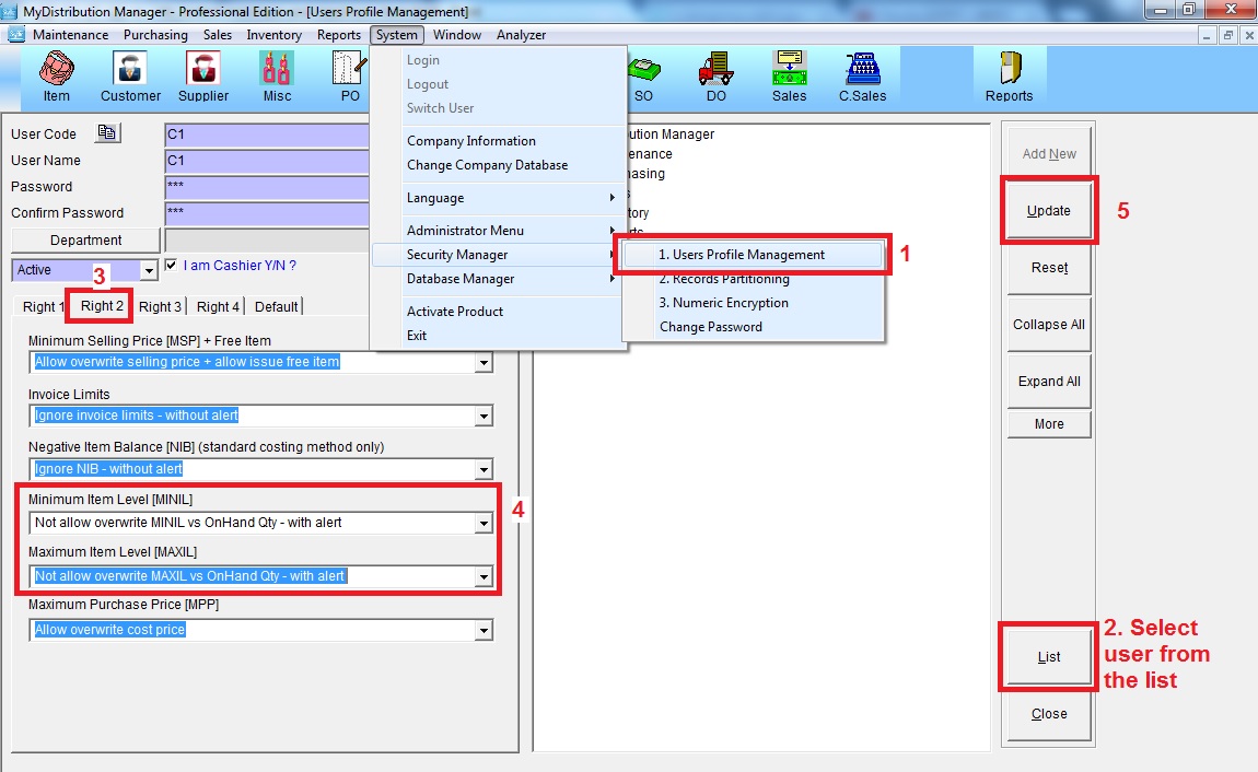 3.- Minimum item level (MINIL) choose "not allow overwrite Minil vs Onhand qty - with alert" - Maximum item Level (MAXIL) choose "not allow overwrite Maxil vs Onhand qty - with alert"