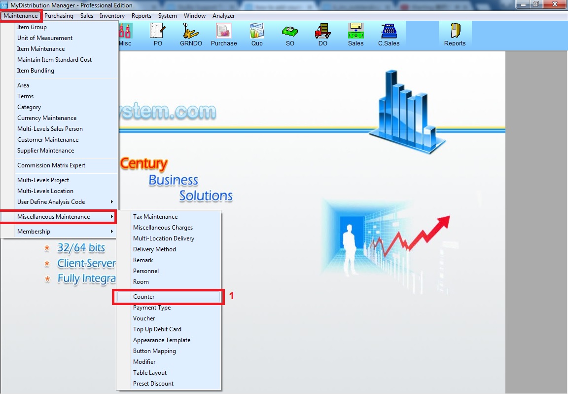 1. Go to Maintenance >> Miscellaneous Maintenance >> Counter