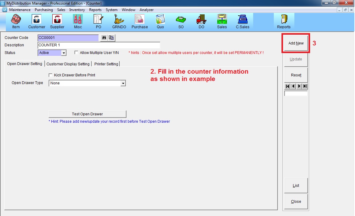 Step 2: Fill in counter code, description and leave status as active >> click "Add New"