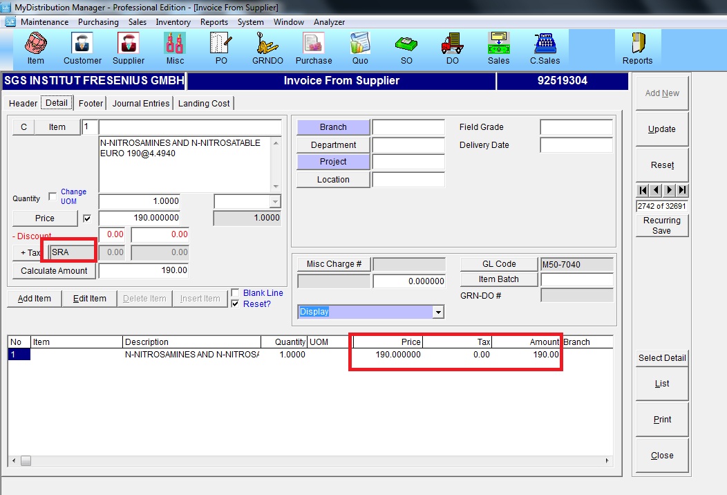 Step 1: Key in a purchase invoice using SRA as tax code, the tax charges will be zero as shown below