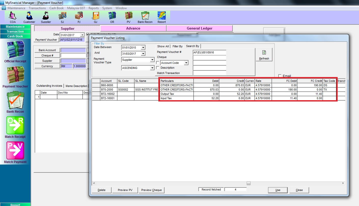 Step 2: Key in a payment voucher to supplier. Reverse charge mechanism is made by recipient during payment to supplier