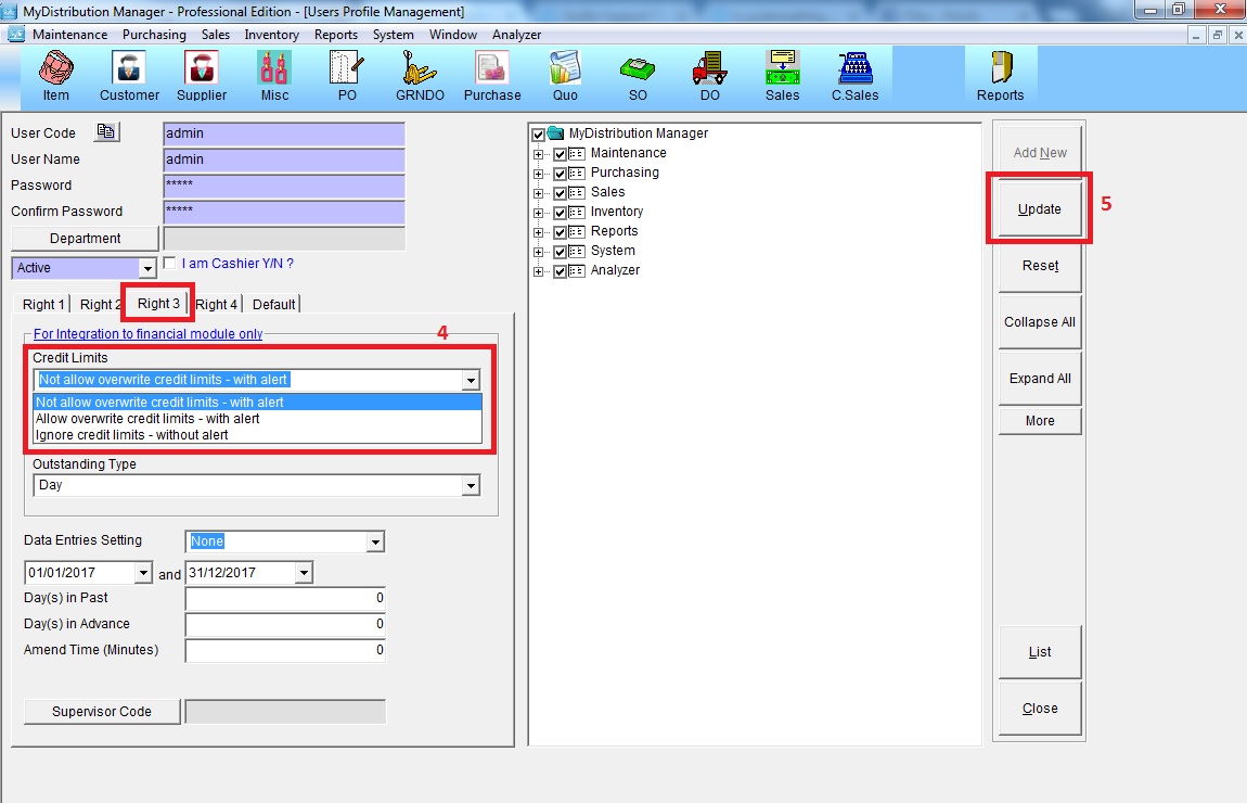 c. Go to "Right 2" and Right 3" >> select the allowance to overwrite Invoice / Credit limit