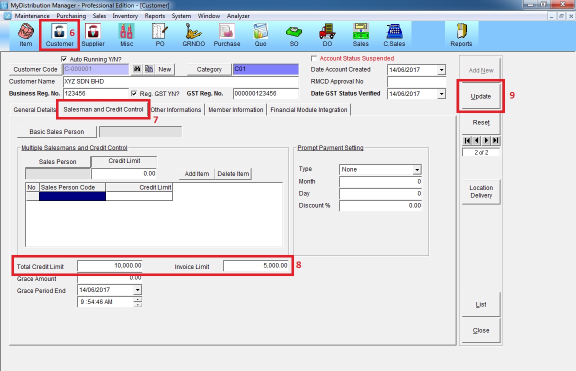 Go to Customer >> Salesman and Credit Control >> key in amount of invoice and credit limit >> click "Update"