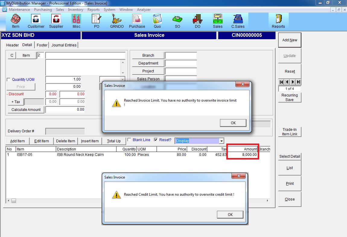 Step 3: if invoice price overwrite invoice limit or credit limit, an alert message will show "Reached invoice Limit" or "Reached Credit Limit"