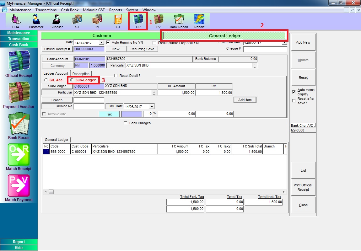 Go to Official Receipt >> General Ledger >> choose "Sub-Ledger" >> key in the deposit.