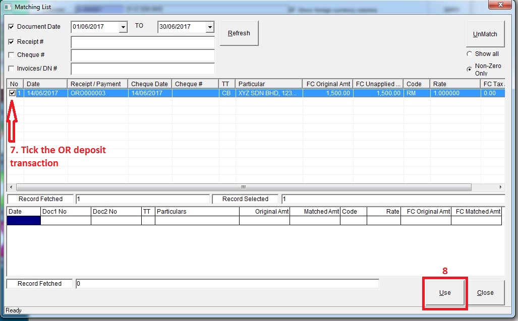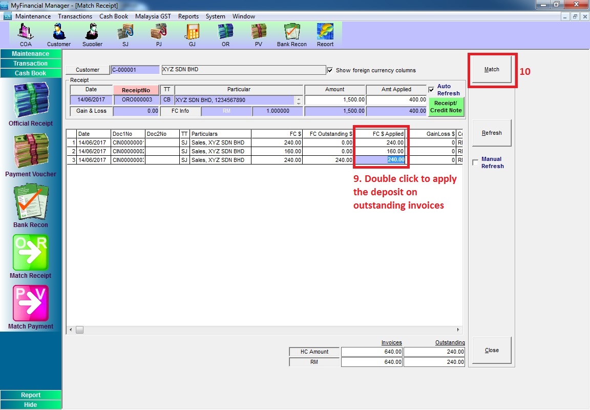 c) Double click in "FC $ Applied" column to apply deposit on the transactions >> click "Match"