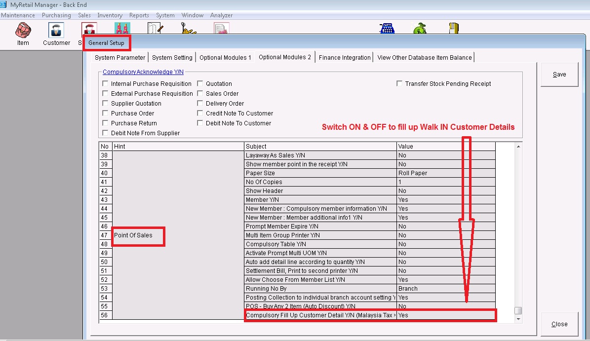 Step 2: Go to Optional Modules 2 >> Choose Y/N for "Compulsory Fill Up Customer Detail"