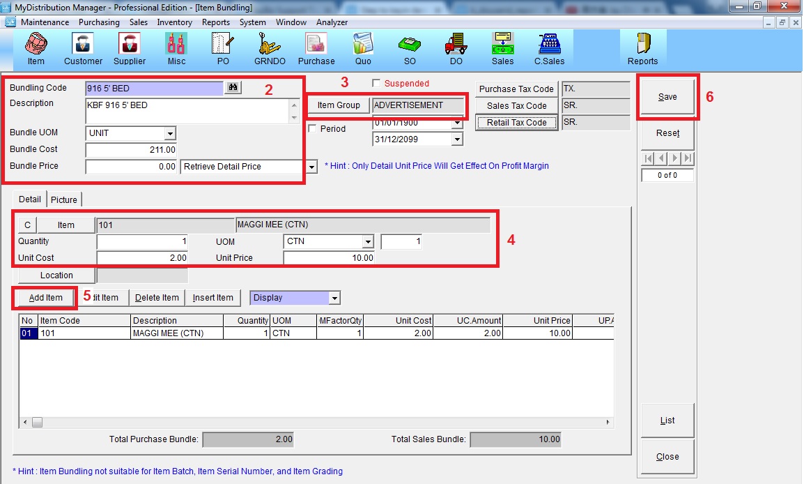 a. Fill bundling code, description, bundle UOM, bundle cost, bundle price