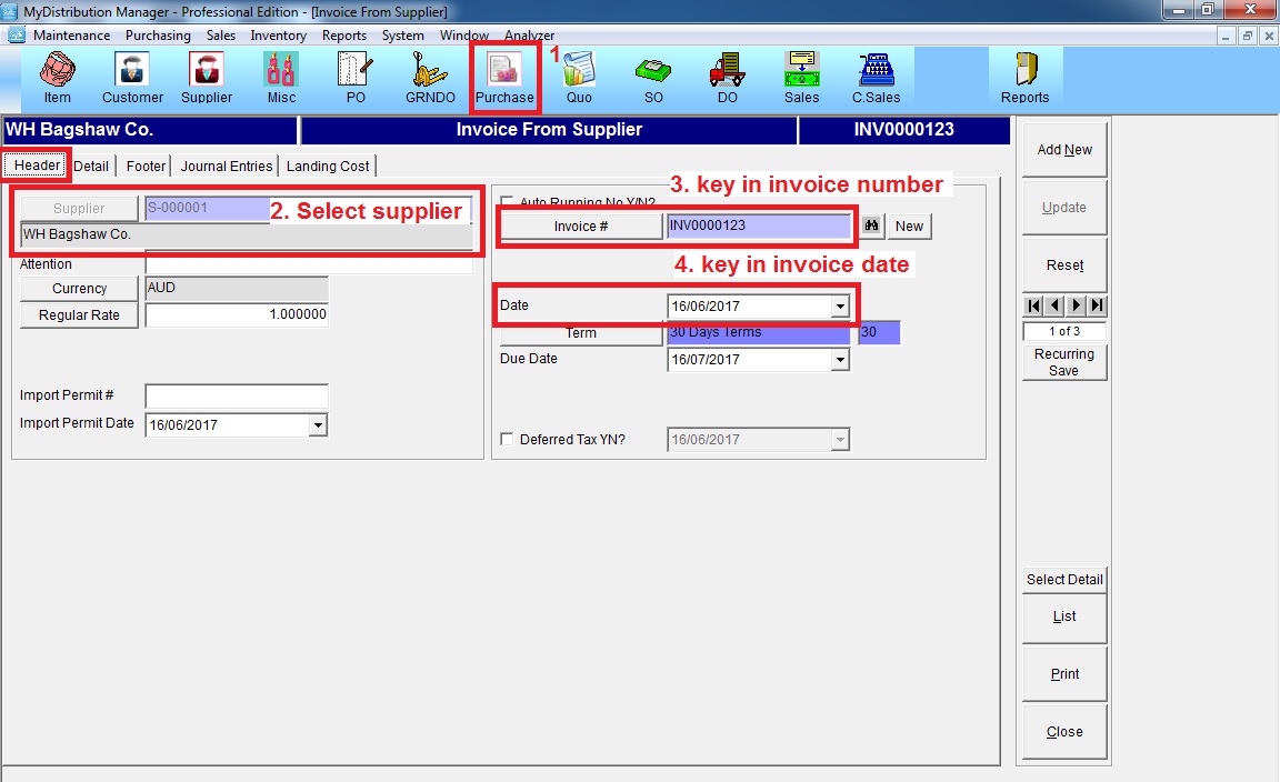 Step 1: Go to "Purchase" >> select supplier >> key in invoice number >> key in invoice date