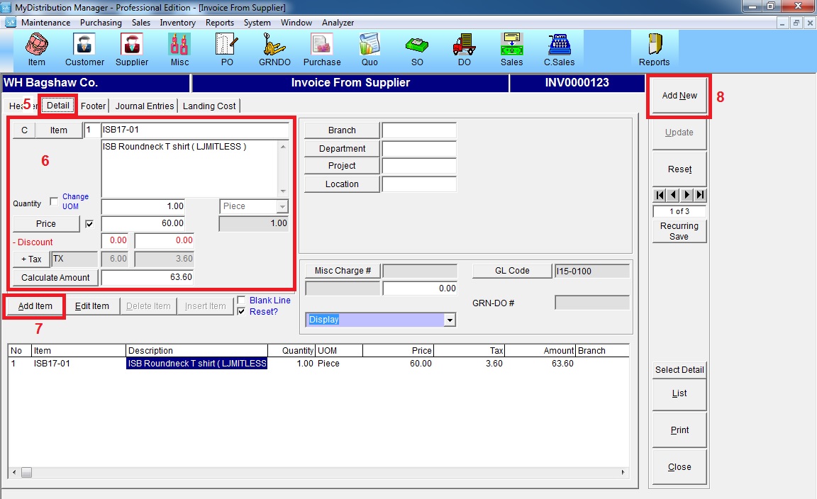 Step 2: Go to "Detail" >> fill in the item, quantity and price >> click "Add Item" >> click "Add New"