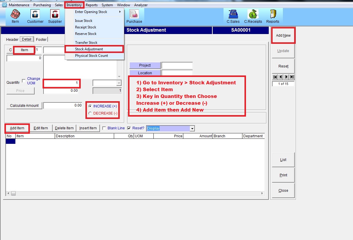 2. Select Item >> key in quantity >> choose Increase (+) or Decrease (-)