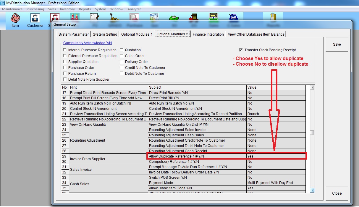 Step 2: Go to Optional Modules 2 >> select Y/N to Allow Duplicate Reference 1#