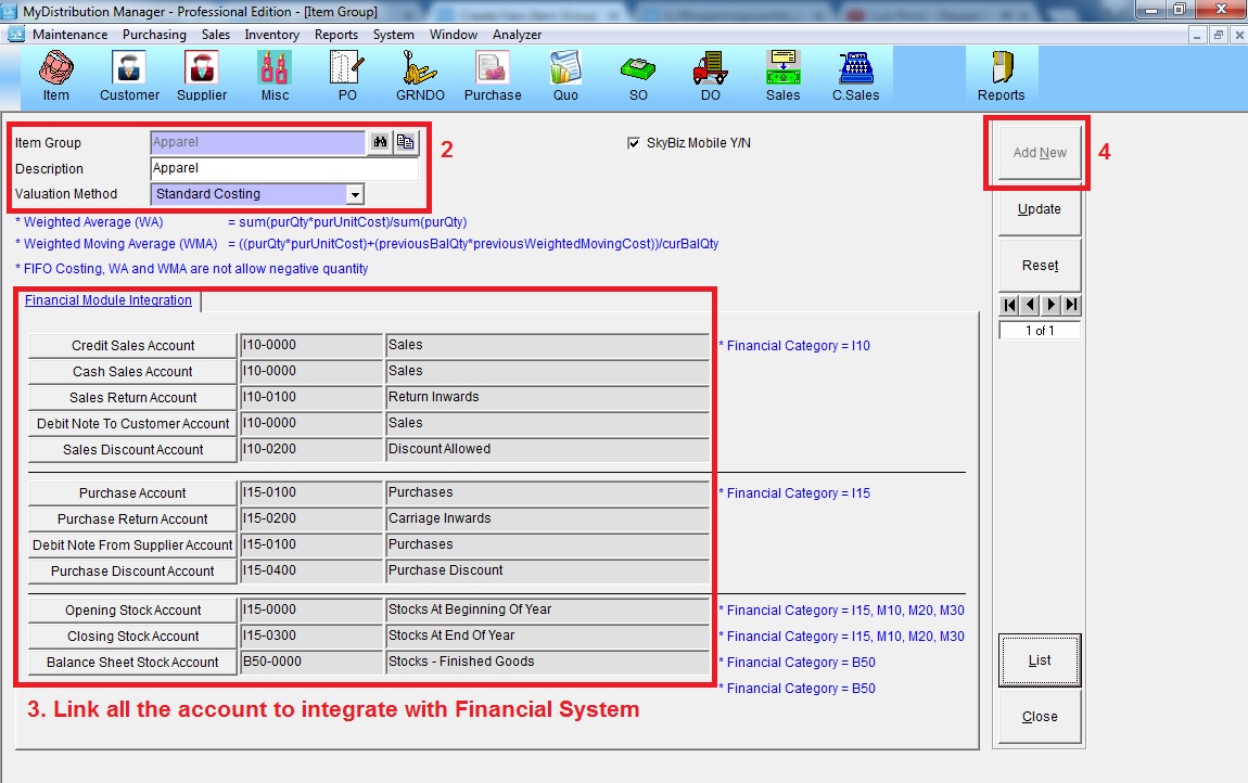 Step 2: Key in item group code, description and valuation method >> link all the account >> click "Add New"