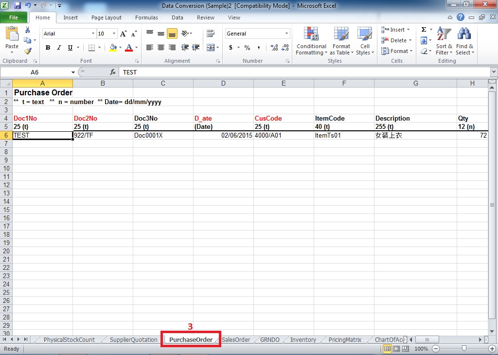 Step 2: Key in all data on Excel Conversion under Purchase Order
