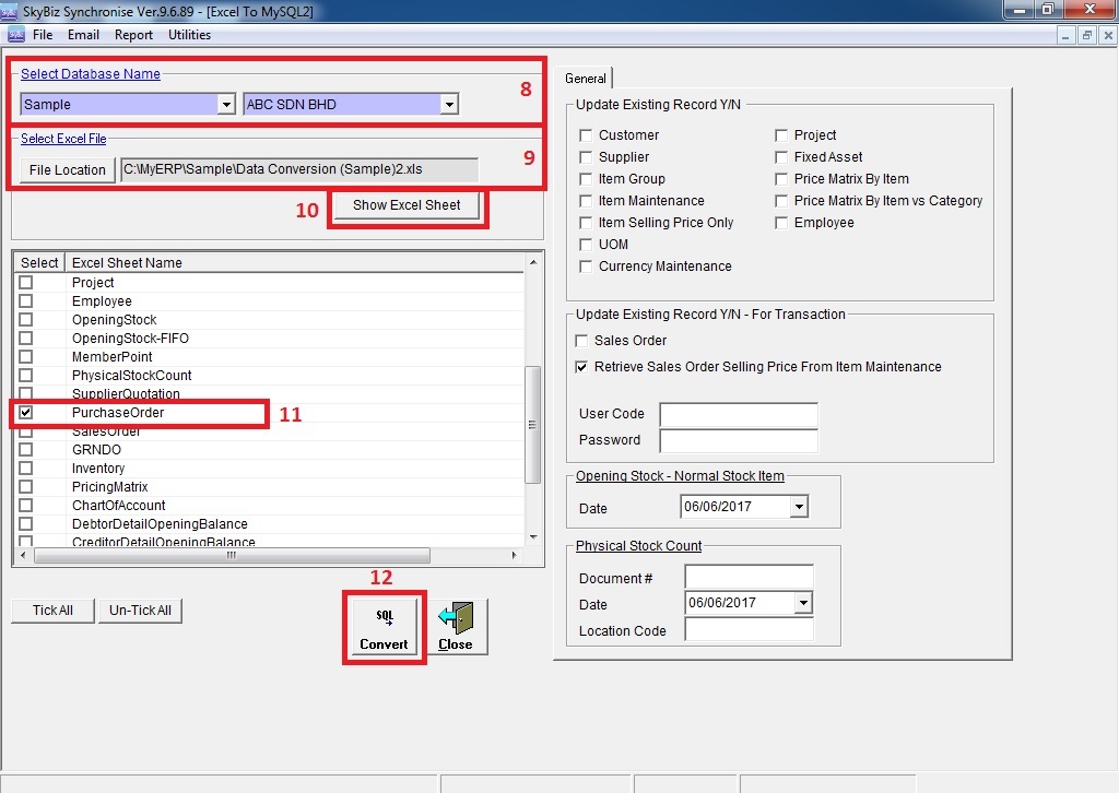 Select Database >> Choose File Location of Data Excel Convert >> Click Show Excel Sheet >> Tick Purchase Order >> Click SQL Convert