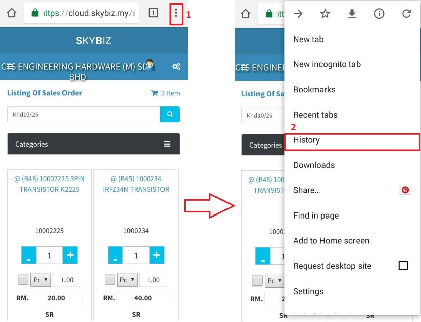 Step 1: On top right corner of your mobile browser, click the 'more option 3 vertical dots icon' >> click History