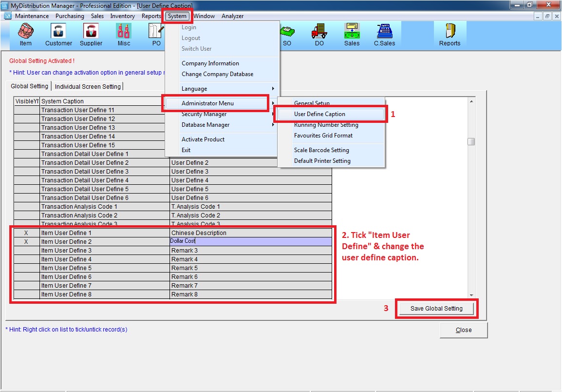 Tick "Item User Define" (It depends on how much you would like to add) >> change the user define caption >> tick "Save Global Setting"