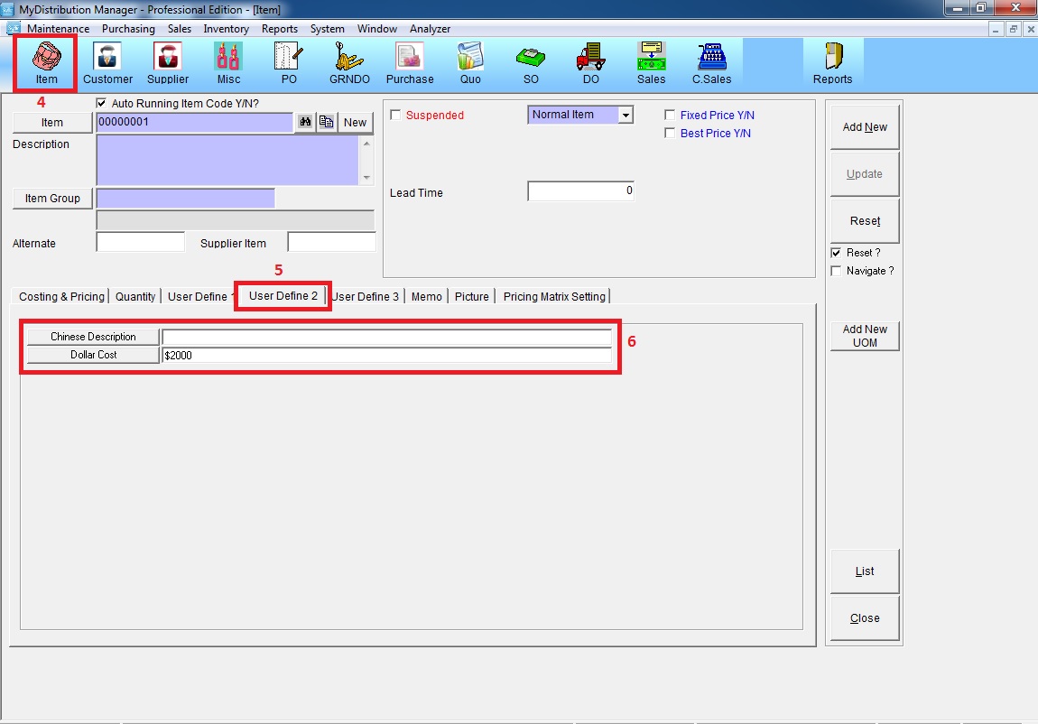 Step 2: Go to "Item" >> User Define 2 >> key in the remark