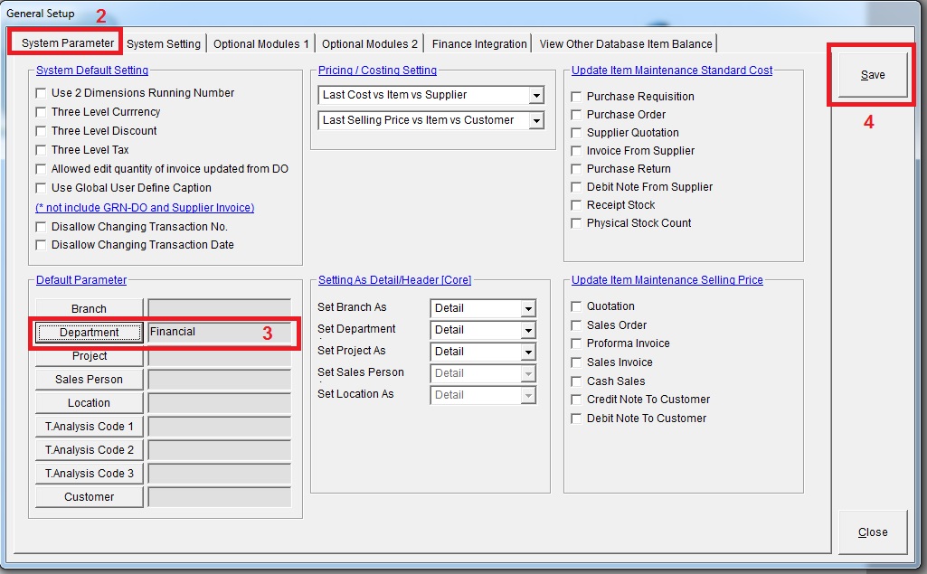 Step 2: At System Parameter >> select department to set as default >> click "Save"