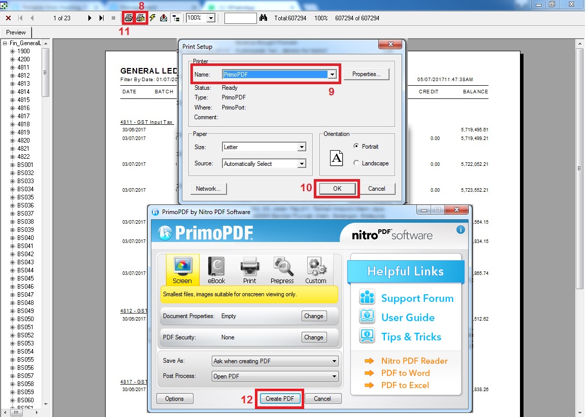 Click "Printer Setup" icon >> set printer as "Primo PDF" >> click "OK" >> click "Print" icon >> the report will open as a PDF file