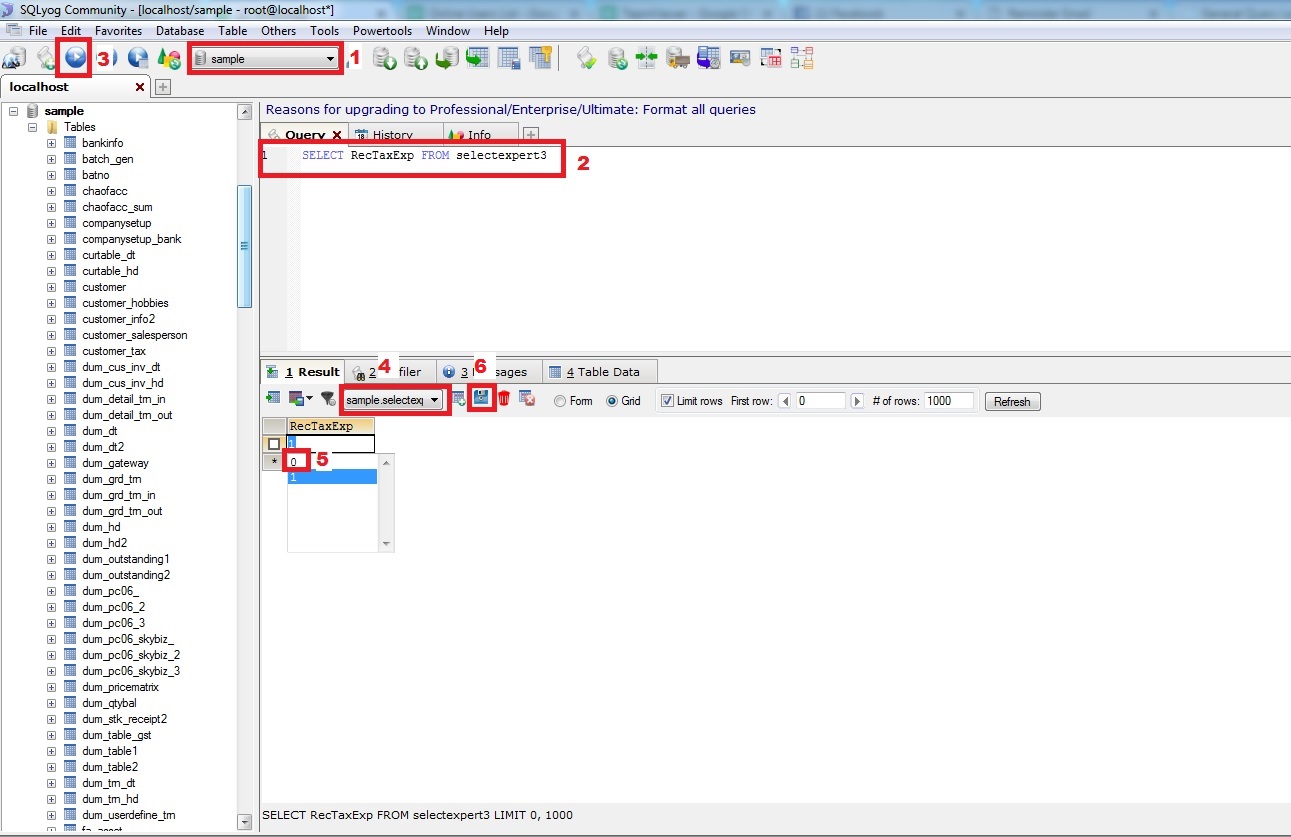 2. Key in Query : SELECT RecTaxExp FROM selectexpert3