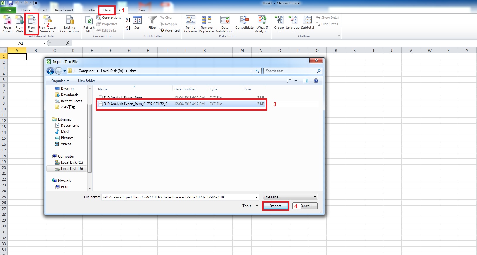 1) Go to Data > 2) Choose From Text > 3) Choose the exported text file from system > 4) Import