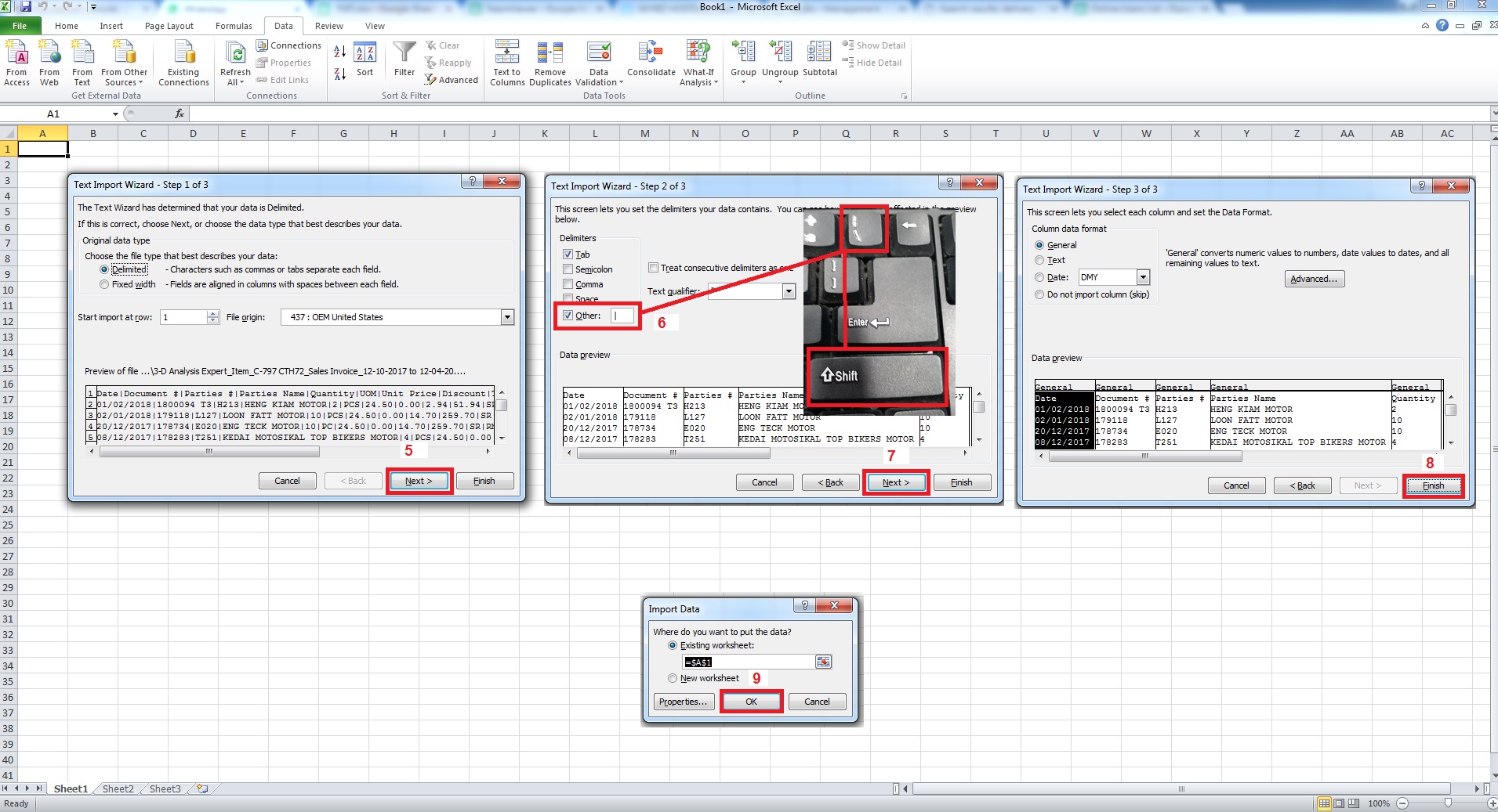 5) Next > 6) put delimiters on Other column/box > 7) Next