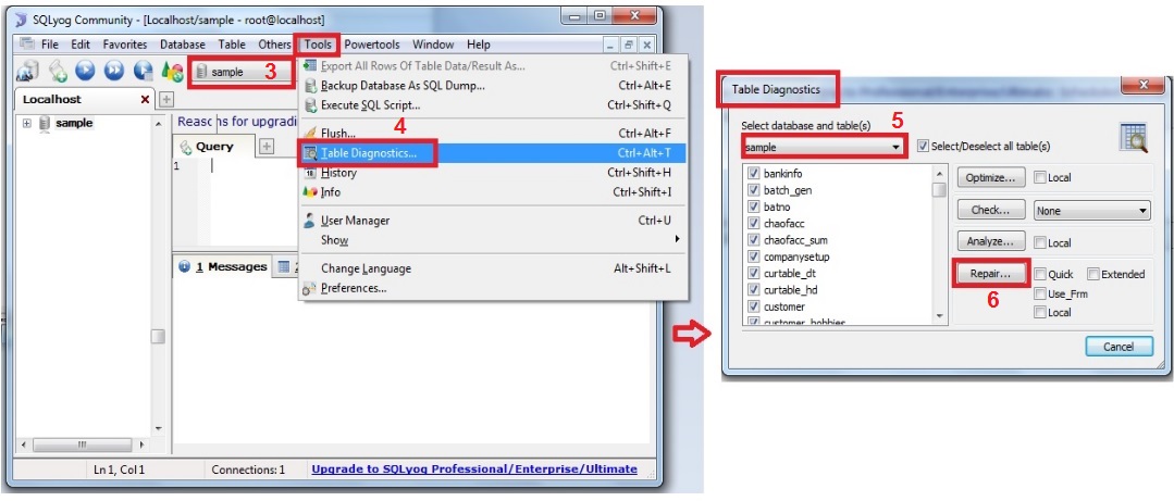 3. Choose Database (eg. Sample) which want to Repair >> go to "Tools" > Table Diagnostics >> Click "Repair"