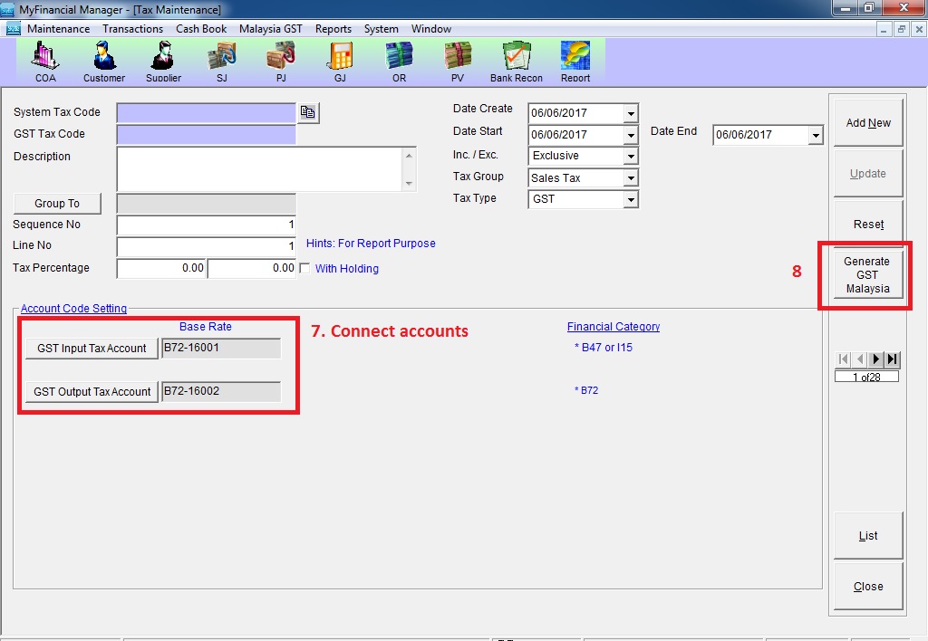 Step 1 : In MyFinancial, go to Chart of Account (COA) >> Add New account for GST under B72