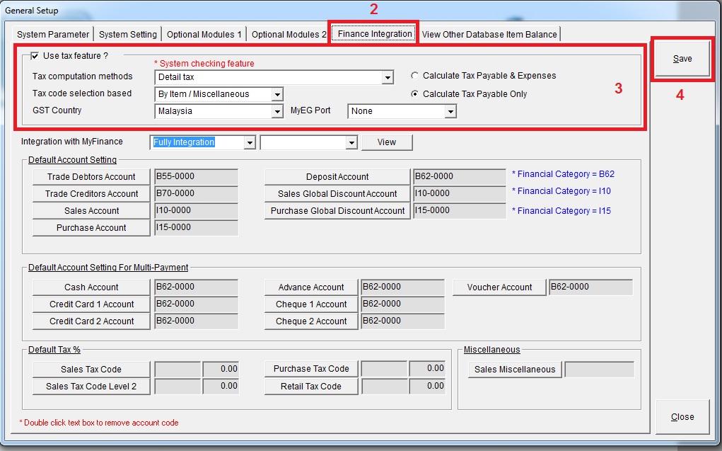 Step 2: Go to Finance Integration >> tick "Use tax feature?" >> select all option as follow >> click "Save"