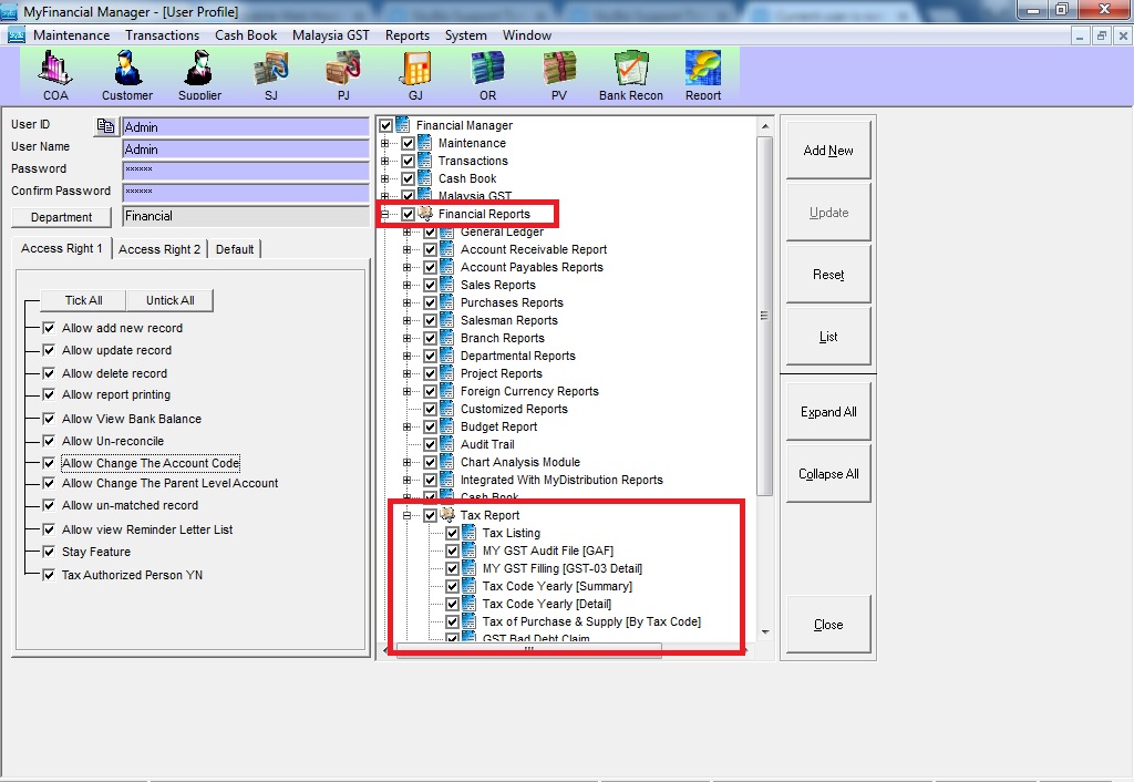 Step 2: Under Financial Reports, tick the user allowance to access "Tax Reports"
