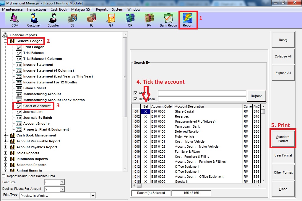 Step 1: MyFinancial > Report > expand General Ledger > click Chart of Account > tick the account you would like to print > click Standard Format to print.
