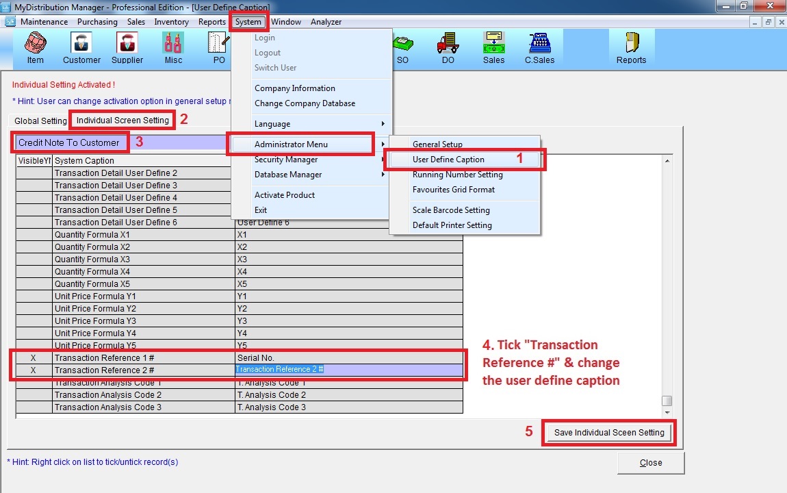 Choose "Credit Note to Customer" >> tick "Transaction Reference #" (It depends on how much you would like to add) >> change the user define caption >> tick "Save Individual Screen Setting"