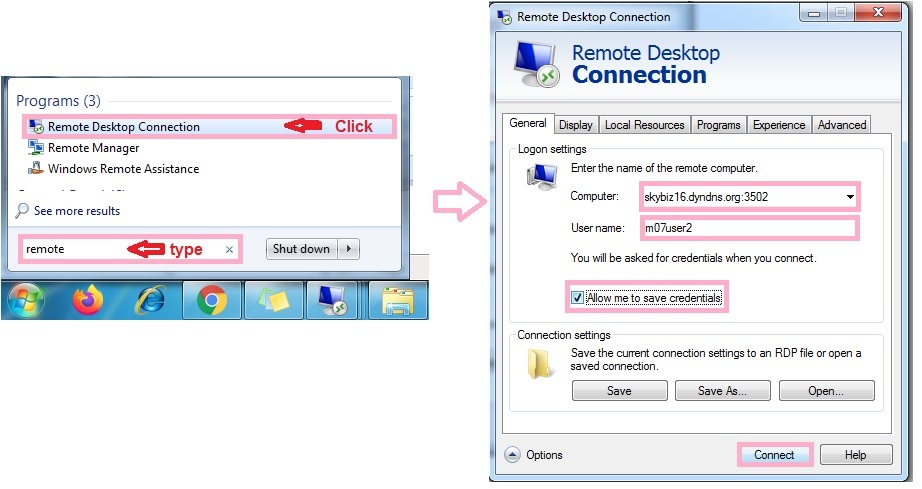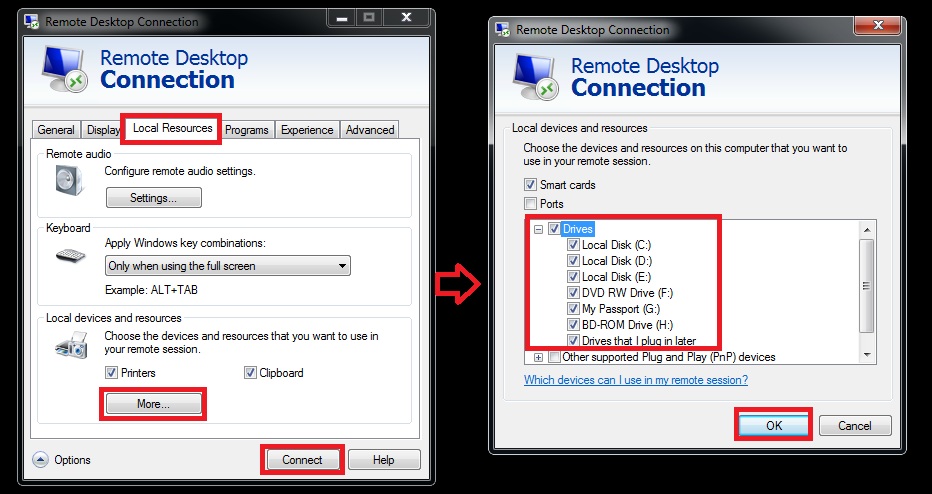 Step 2. Go to Local Resources >> Click More>>tick Drive and click Ok>>Press Connect